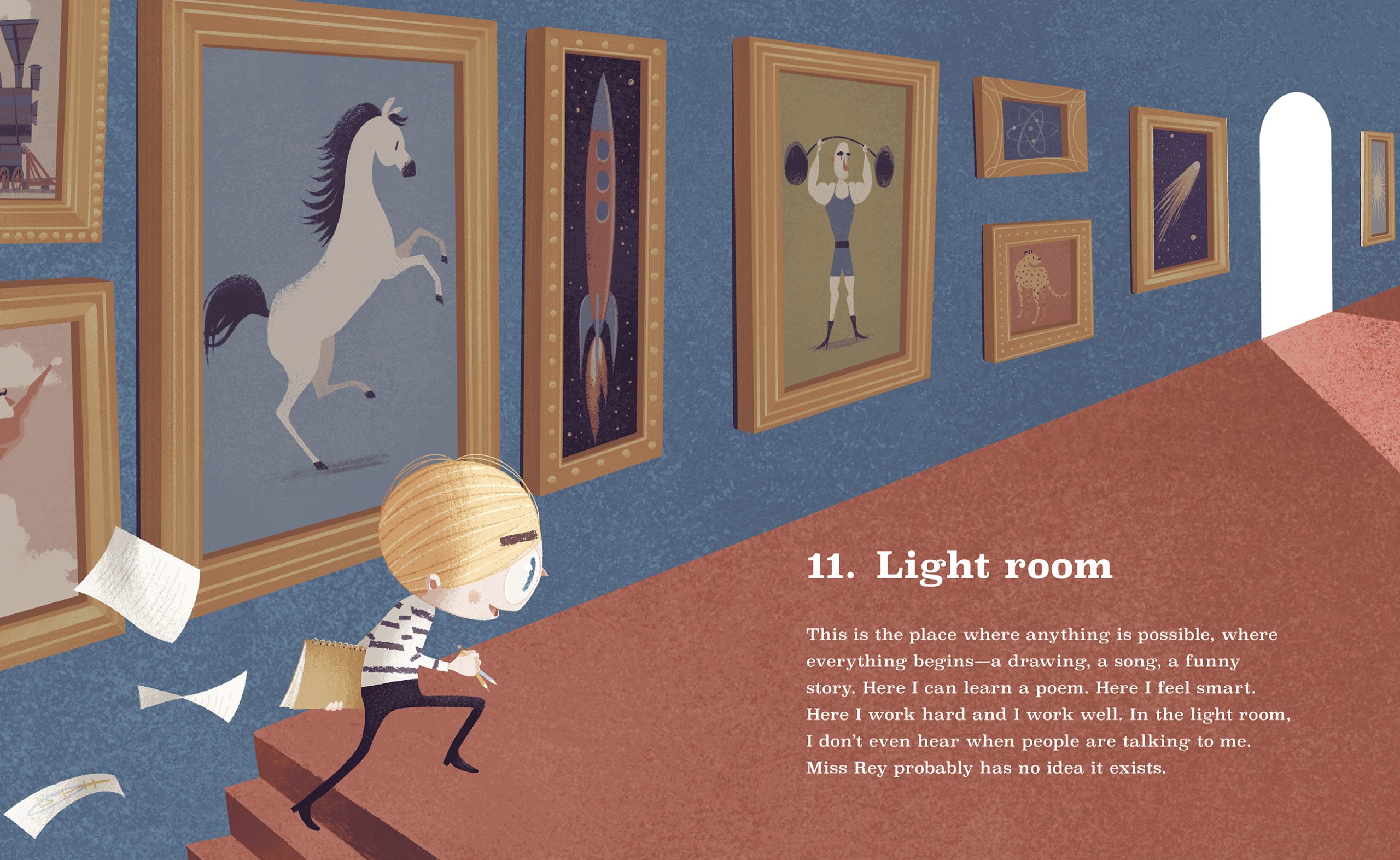 At school, when he tries to recite a fable in front of his class, he blows it. Even though he knows it by heart, not a single syllable comes to mind. Vincent feels like a misfit when people tell him to just concentrate, and he often has trouble in school. He can’t seem to think, but he also can’t stop thinking. Sometimes he wants to escape his own head and just be like everyone else. But maybe Vincent doesn’t have to be the same as everyone else after all. Maybe he just has to learn how to look, to find the light room and see things in his own way.